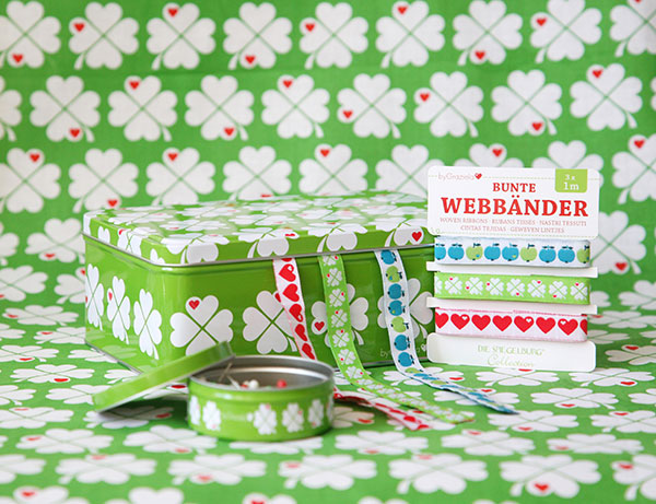 Auch byGraziela ist mit einem schönen Glücksklee-Set mit einer praktischen Metalldose, den süßen Webbändern und den Stecknadeln im Graziela-Glücksklee-Döschen mit dabei!