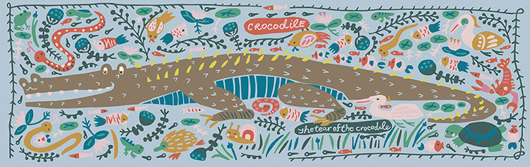 Laid flat, the fabric reveals it’s full splendor: Stylized foxes, crocodiles and peacocks! Which is your favourite? The fabric is a full 140 cm on the bolt and the repeat measures just under 50 cm. While supplies last!
