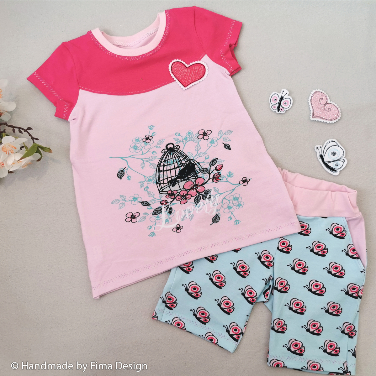 Handmade by Fima Design: Shirt Mila / EmLuMaMa ( Freebook), Shorts “Deine Suri Kids” / Meine Herzenswelt, Gr. 110. Kombiniert mit Heike in Fb. 432 Stickdatei: Valerie Papillon / Kunterbuntdesign