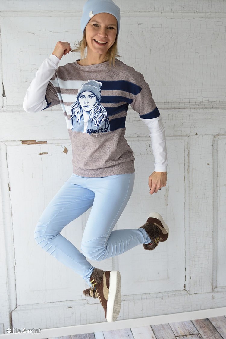 Lila & mint: Sweater Dina / Schnittgeflüster. Biker Leggings Tara und Beanie / beide von Pattydoo. Genäht in Gr. 36. Kombiniert mit Vanessa in Fb. 252 und 011 sowie mit Amy in Fb. 252.