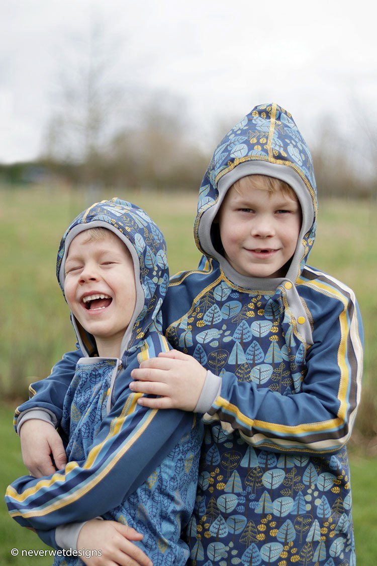 Sweat Amko ist kuschelig angeraut und kommt in zwei Varianten: Helles Beige mit Windrädern und ein schönes dunkles Petrol mit gemusterten Kringeln.